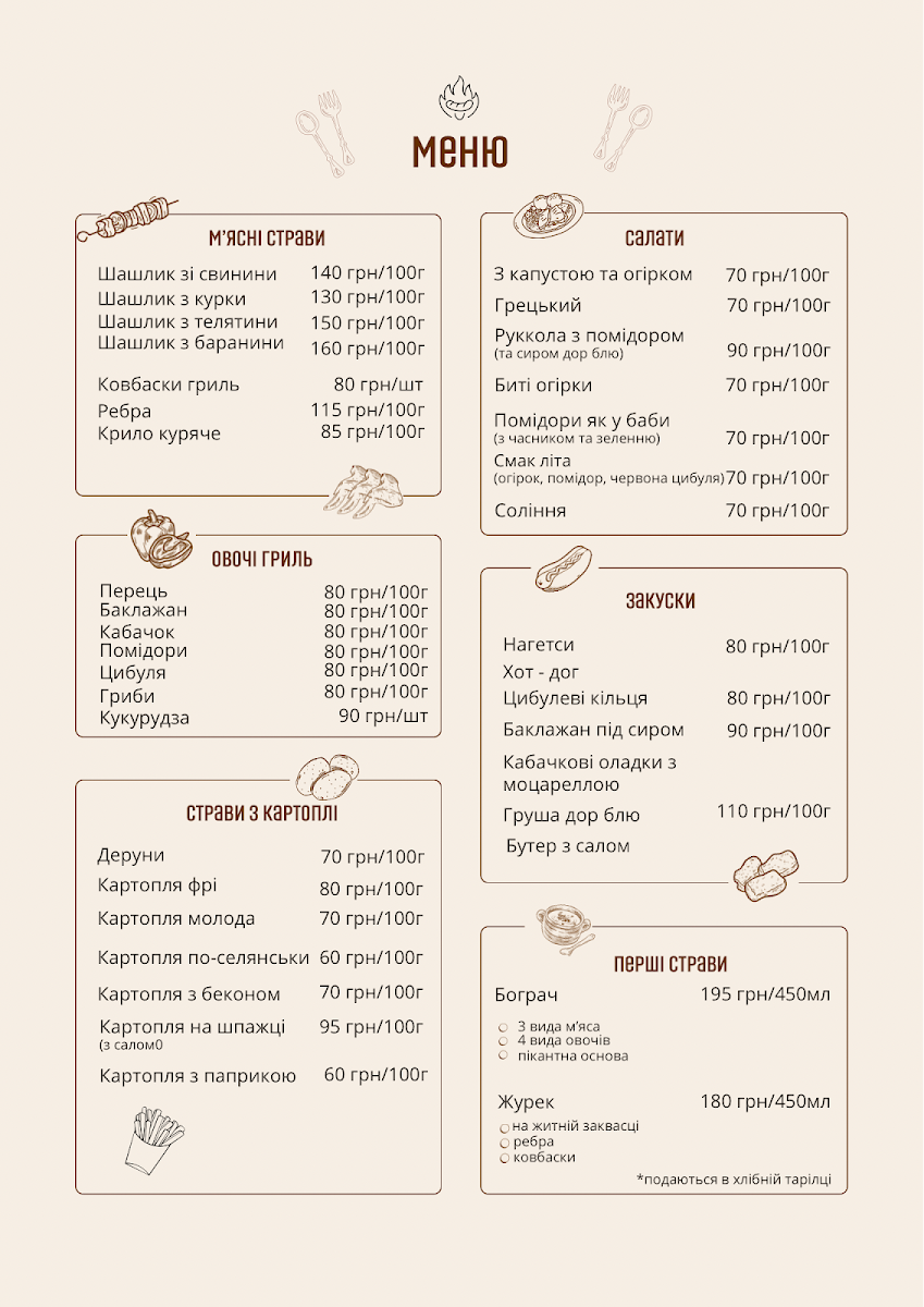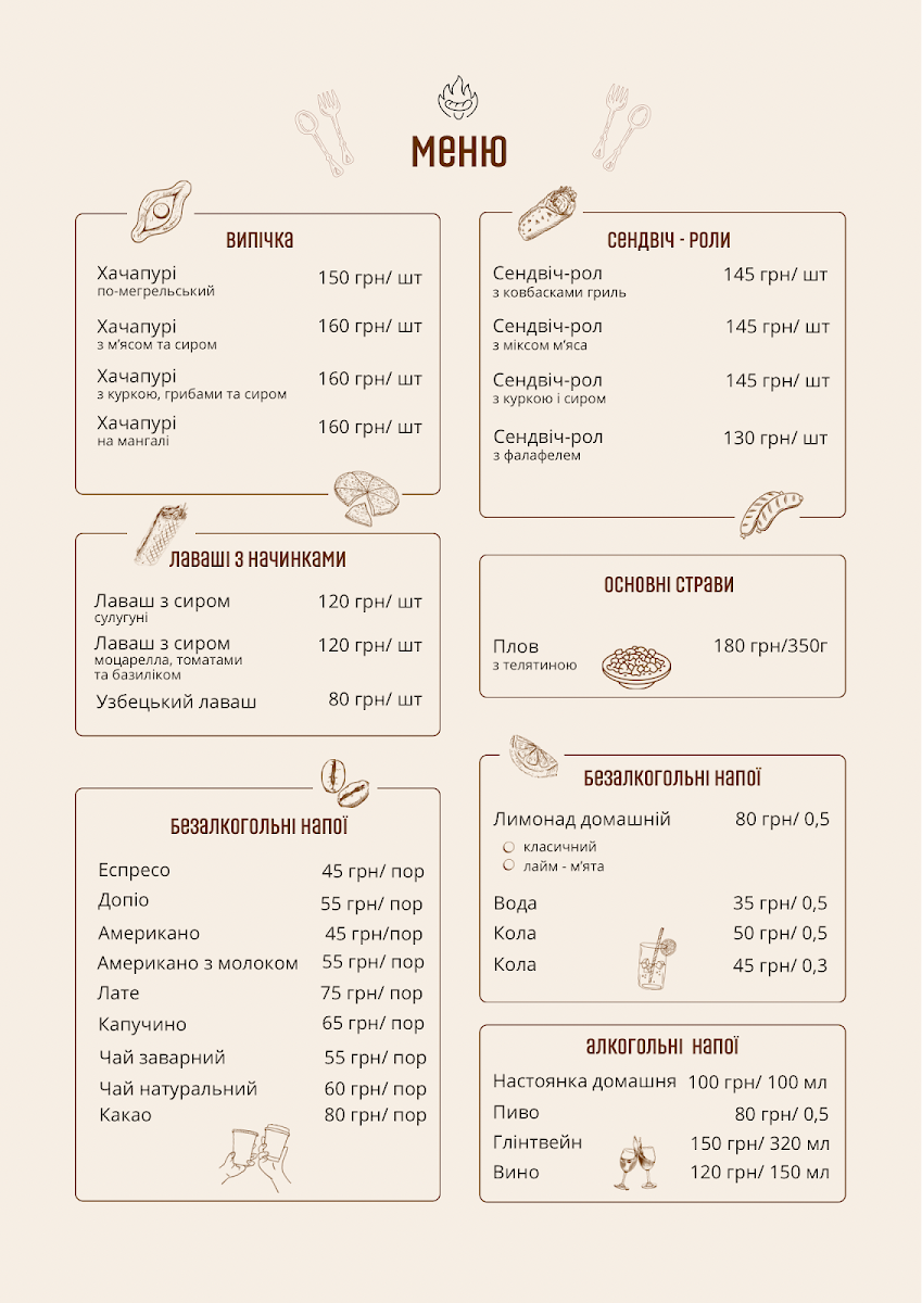 Overall, the menu is structured to provide items that are typically enjoyed in a café setting, focusing on grilled and traditional Ukrainian cuisine. Ordering is usually straightforward, allowing for both individual and group dining experiences.